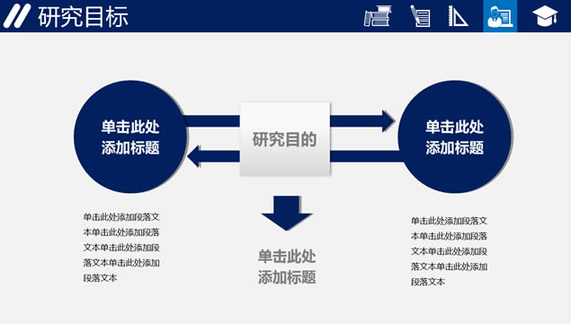点击进入论文答辩通用ppt模板,目录:选题背景、研究意义、研究综述、理论综述、主要贡献,教育教学图标元素、蓝灰配色,简约扁平化大气设计,通用论文答辩、毕业答辩ppt模板。标签:论文答辩,毕业答辩。