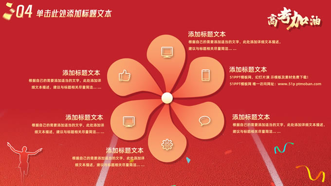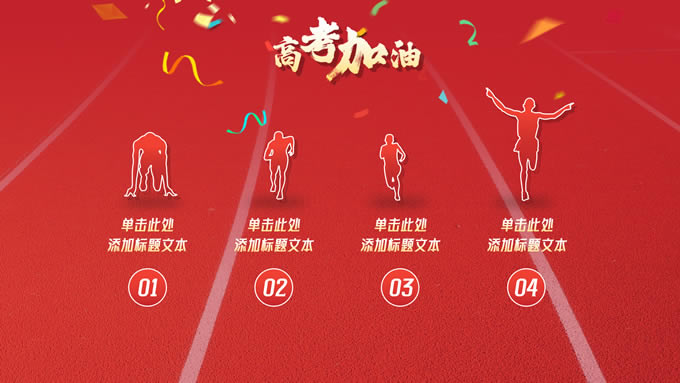 简介:高考加油冲刺主题班会ppt模板,本模板共23P,跑道背景,礼花、冲刺终点剪影学生创意字体封面、目录页、过渡页,喜庆红黄配色,激情活力版式内容页,适合高考冲刺、高考加油等场景应用的高考主题班会ppt模板。标签:高考冲刺,高考加油,高考,教育。