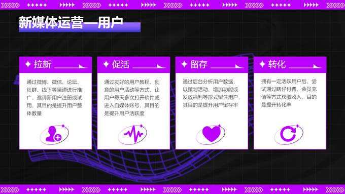 简介:紫色酸性风格新媒体运营培训课件ppt模板,本模板共19P,目录:新媒体的概念 、新媒体的特点、新媒体运营理论、运营案例解析,运用网格、几何、3D图形、文字元素创意封面,新潮版式内容页,适用于培训课件、营销方案等场景应用的酸性风ppt模板,P界达人 背影狂欢 作品。标签:新媒体运营,新媒体,酸性。