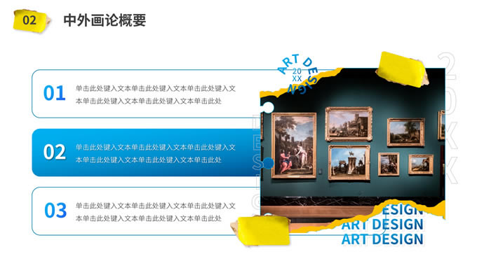简介:艺术设计专业大学艺术系课程课件ppt模板,本模板共18P,目录:中外美术史、中外画论概要、艺术理论课,褶皱纸张背景,撕边撕纸艺术创意封面、目录页、过渡页,渐变蓝黄配色,扁平化图表,艺术范版式内容页,适合教师说课、艺术设计课件等场景应用的大学艺术系课件汇报通用ppt模板。标签:艺术设计,艺术系,课程课件。