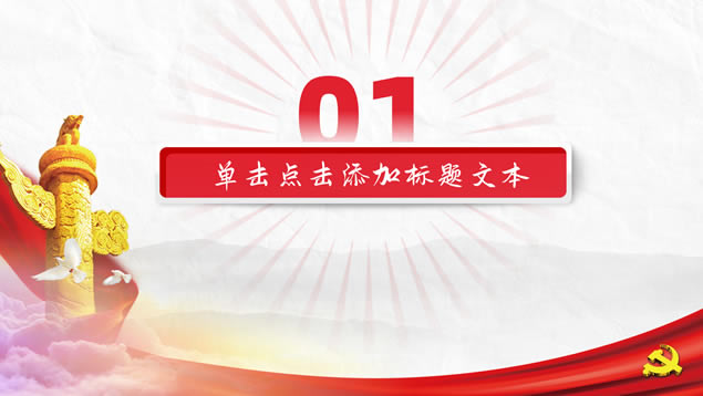 简洁大气实用党政风工作汇报ppt模板,本模板共16P,淡雅红连绵山川背景,金色立体党徽、国旗、天安