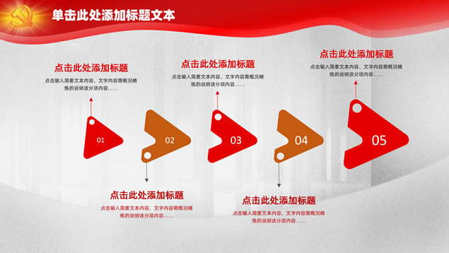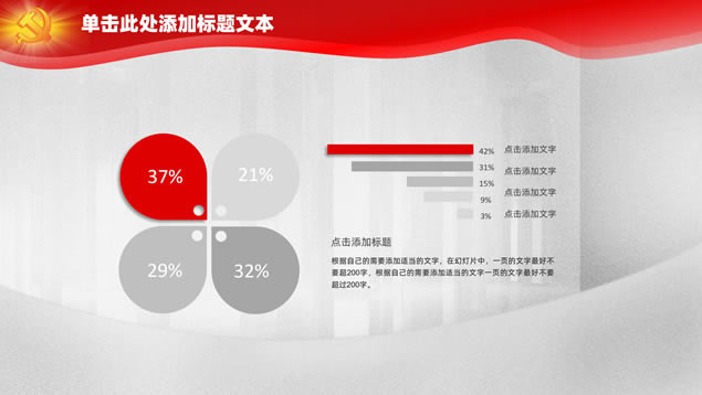 简介:简洁大气党政风党建工作汇报ppt模板,本模板共23P,几何风灰度背景,华表、和平鸽、渐变文字几何图形几何框简洁大气设计封面、目录页、过渡页,庄严红配色,大气质感图表,党建素材配图,适合党建工作汇报、党课课件等场景应用的党政风通用ppt模板。标签:党政风,党建。