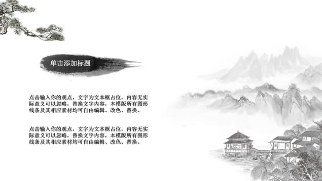 简介:简约素雅灰大气中国风ppt模板,本模板共23P,淡雅灰水墨山川水墨画封面背景,仙鹤、渔翁泛舟、毛笔字体创意设计封面,黑白灰配色,水墨风格排版,水墨龙、竹、仙鹤、山水画、古典房屋、松树、梅花等中国风素材配图,适合工作汇报、工作总结等场景应用的中国风ppt模板,“P界达人”李曙作品。标签:中国风,素雅。